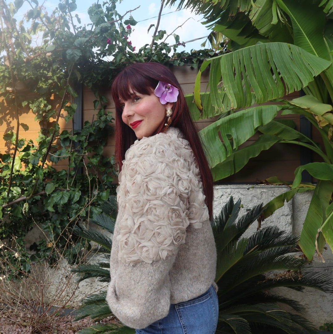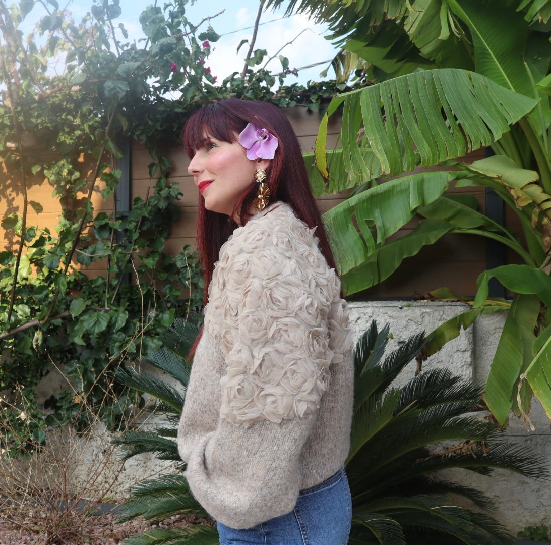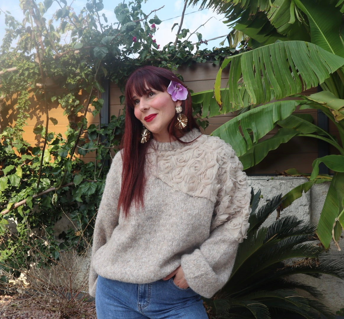 Le Pull Rosita est orné de roses en relief. Il est disponible en TU, convenant