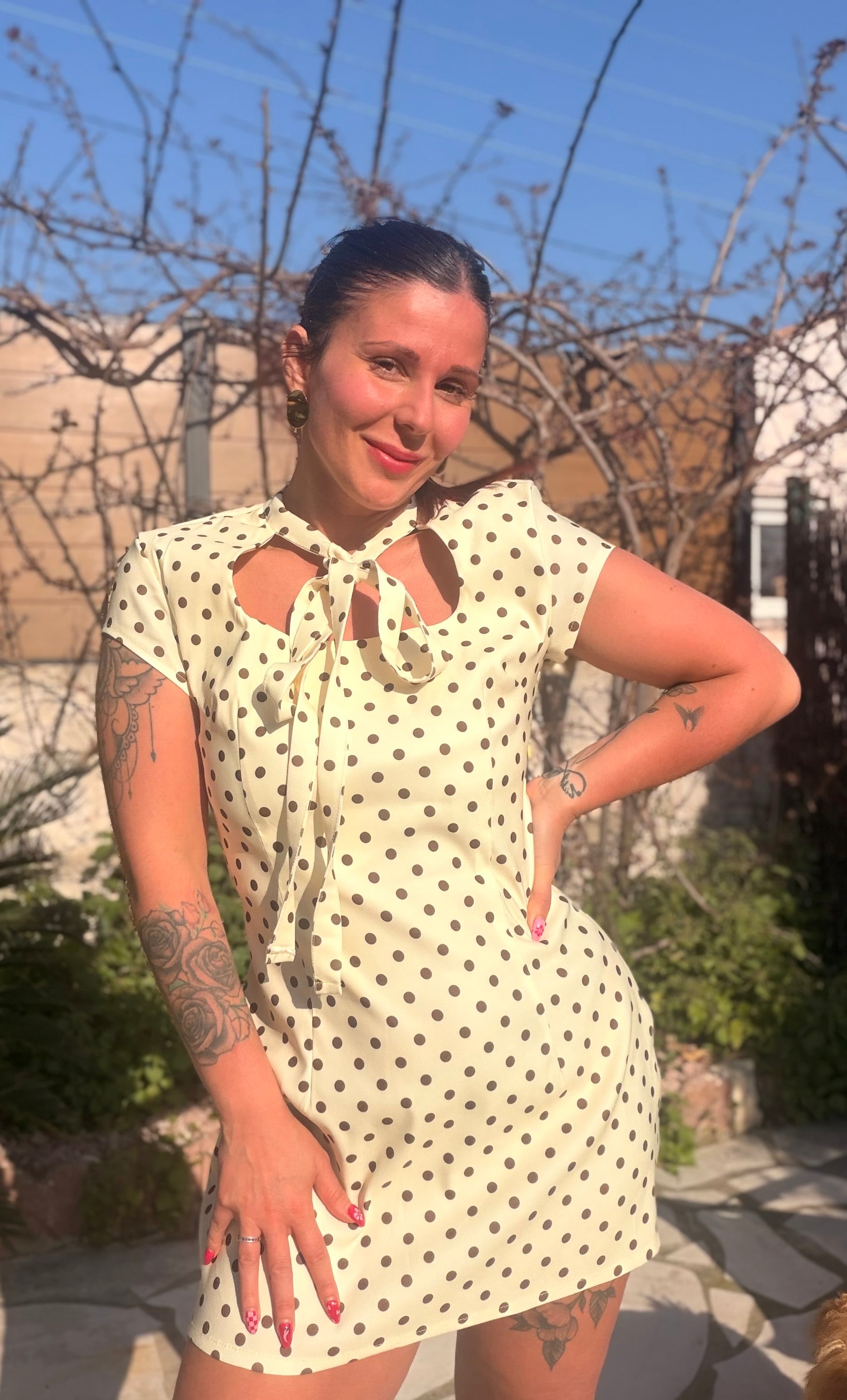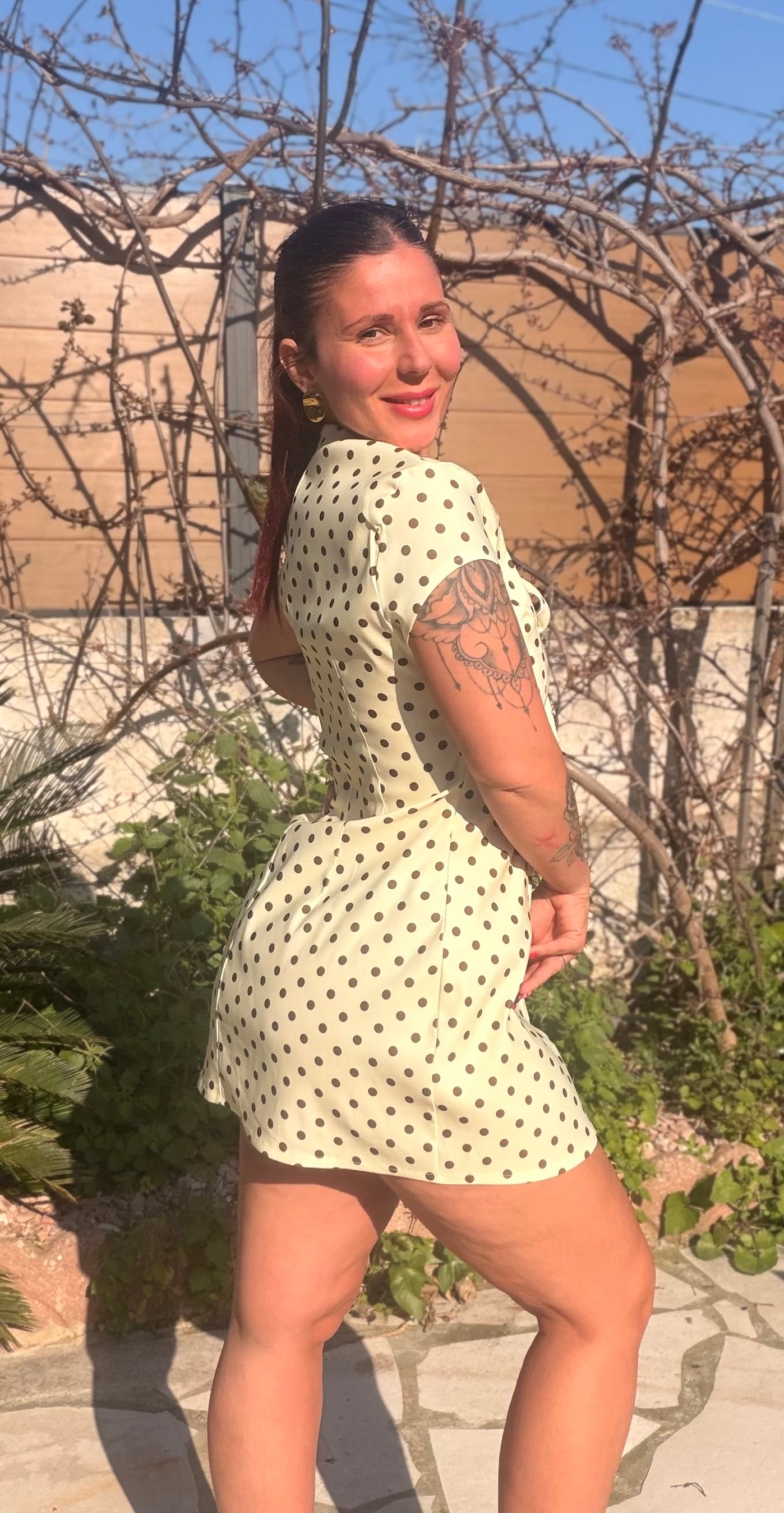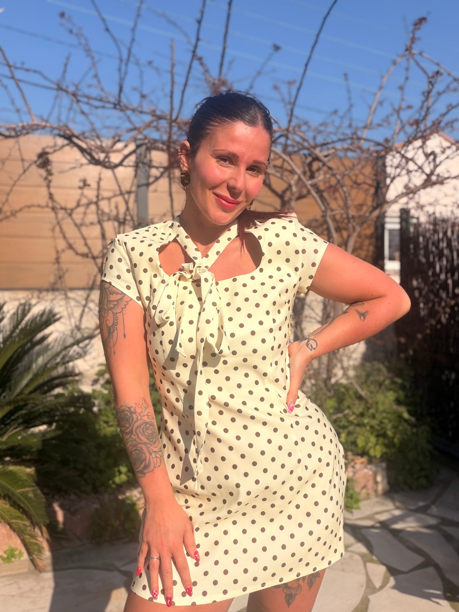Robe à pois disponible en taille unique. Cette robe va pouvoir aller jusqu’à une taille 42. Elle est très confortable et assez élastique.