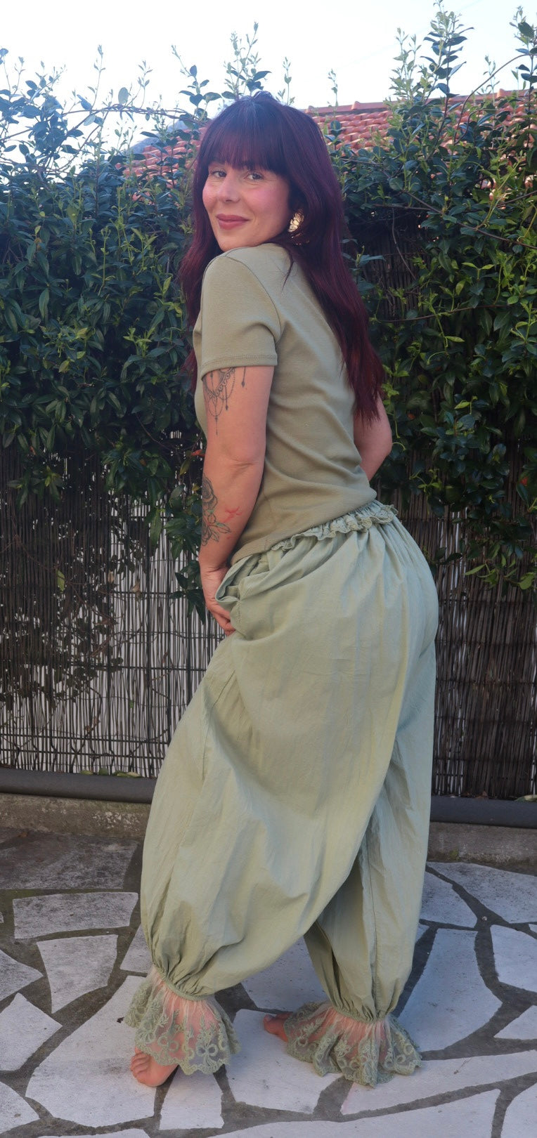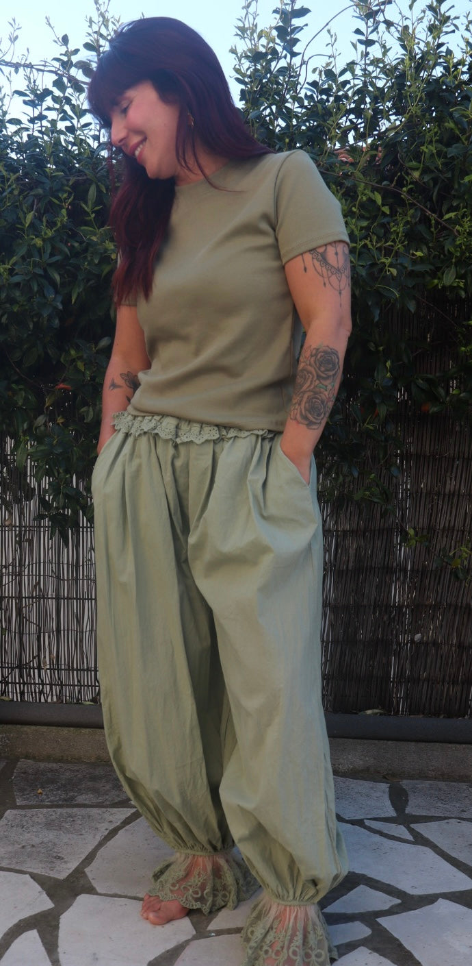 Saroual kaki en coton avec une doublure à l’intérieur sans transparence. Disponible en TU il va pouvoir aller jusqu’à une taille 44